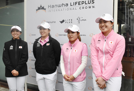 米女子ゴルフの国・地域別対抗戦、ハンファライフプラス・インターナショナル・クラウンは26日、韓国・高陽で決勝トーナメントが行われ、日本は4位だった。写真は3位決定戦を終え、笑顔を見せる日本チーム。 【時事通信社】