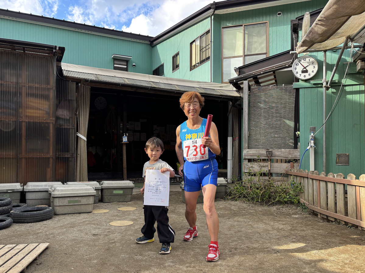 W65 4×100メートルで世界記録を樹立した松尾さんと孫。にこにこ保育園の園庭で