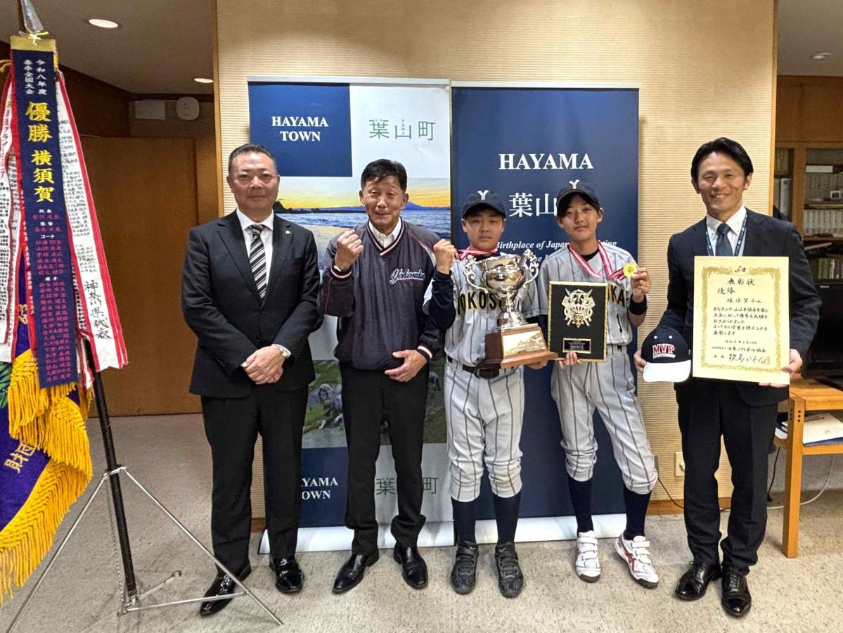 葉山町立長柄小学校(葉山町長柄)6年の亀田隼永さんが4月24日、同町役場を訪れ、山梨崇仁町長に「第19回春季全日本小学生男子ソフトボール大会」優勝と最優秀選手賞受賞を報告した。