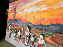 ままださんの和紙を使う貼り絵の特徴は同じ和紙で作る人形が融合している点。「人形作りは面白い。童画として立体的になり独自の貼り絵になっていると思う。色合いも日本の情景として心に響くものにし、カラスなどの小動物も欠かさない。どこか切なく懐かしい日本の昔の日常を忘れたくないと思っている」とままださん。