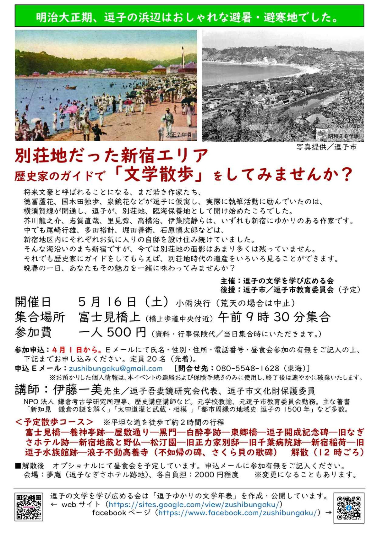 市民団体「逗子の文学を学び広める会」が5月16日、逗子・新宿にゆかりのある文人の足跡をたどる「文学散歩」を行う。