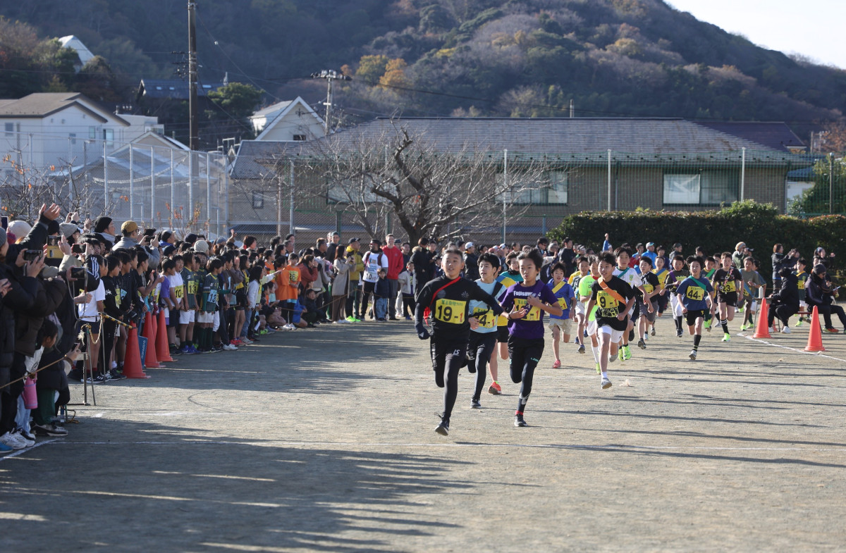 昨年、1部1区のランナーが校庭内を走る様子(提供=三浦郡葉山町陸上競技協会)