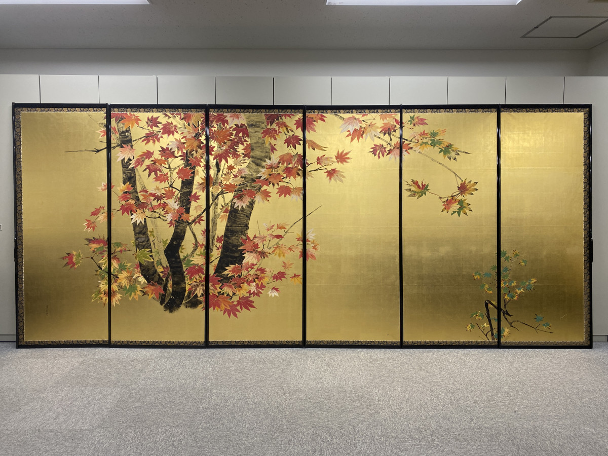後期(10月28日)から展示する山口蓬春《梅花紅葉》のうち「紅葉」(左隻) 昭和9(1934)年/国際興業コレクション蔵(平塚市美術館寄託)、第3回青々会展出品