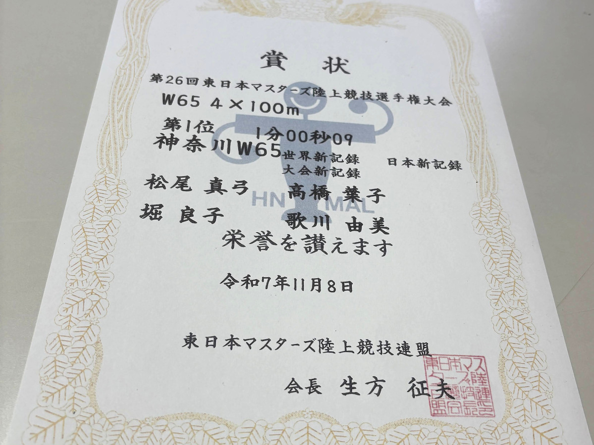 葉山の「にこにこ保育園」(葉山町長柄)の松尾真弓園長が、11月8日に八王子市上柚木公園陸上競技場で開催された東日本マスターズ陸上競技選手権大会の「W65 4×100メートル」で、神奈川県チームのメンバーとして世界新記録を樹立した。