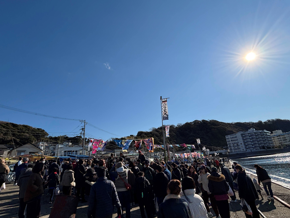 正月恒例の伝統行事「みかん投げ」が1月2日、逗子・小坪漁港で行われ、多くの家族連れでにぎわった。