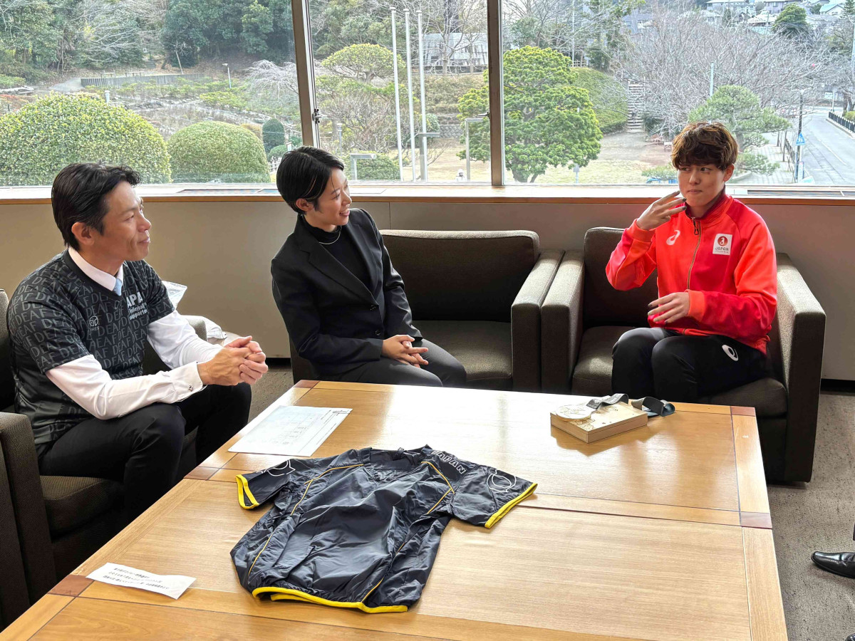 葉山町出身のデフ(聴覚障害者)バレーボール日本代表、中田美緒さんが1月7日、同町役場を訪れ、山梨崇仁町長に「東京2025デフリンピック」優勝を報告した。