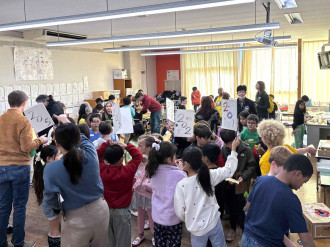 逗子市立逗子小学校(逗子市逗子4)で2月18日、池子米軍家族住宅地区にあるイケゴエレメンタリースクール(逗子市池子)の2、3年生を迎え、同校2年生児童との親善交流が行われた。