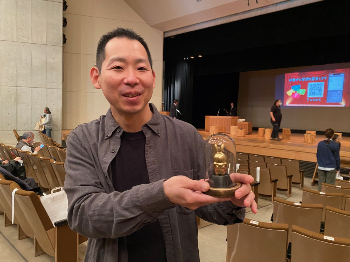 「マイタンブラーキャンペーン」のフォトコンテスト、最優秀賞の磯崎孝博さん。手には「金色のミューシー」