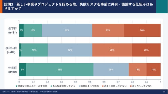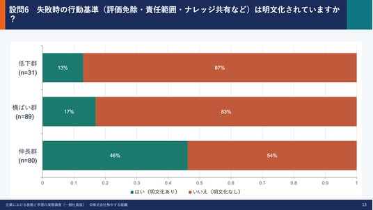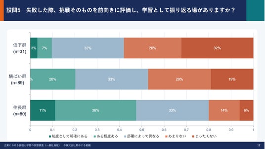 一方で、挑戦や失敗に関する仕組み(リスク共有・振り返り・基準の明文化など)の整備状況においては、より大きな差が確認されました。