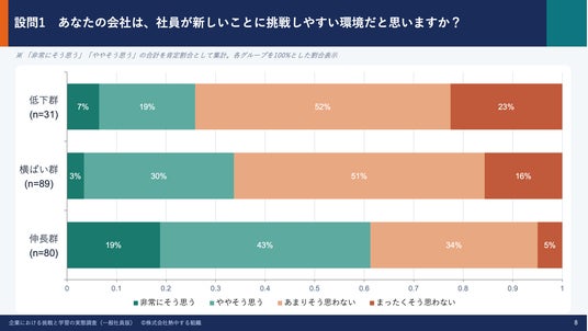 今回の調査では、「自社は挑戦しやすい環境である」と回答した割合は、業績成長企業で61%、横ばい企業で34%、低下企業で26%となりました。