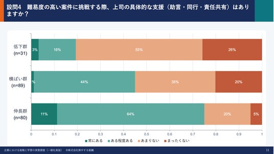 難易度の高い案件に挑戦する際の上司の具体的支援について、業績成長企業では約75%が「支援あり」と回答した一方、低下企業では約19%にとどまりました。