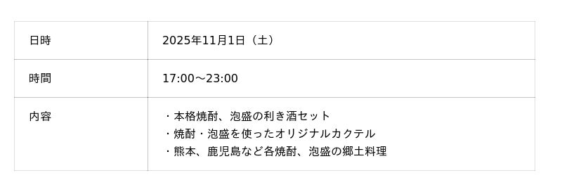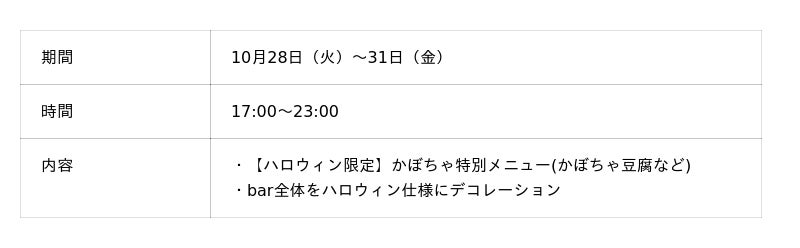 10月28日(火)~31日(金)の期間は、ハロウィンに合わせた飾り付けと、かぼちゃを使用した特別料理をご用意。ご来店の方にはささやかなプレゼントもお渡しします。続く11月1日(土)は、日本酒造組合中央会が定めた「本格焼酎・泡盛の日」。日本酒のプロが厳選した本格焼酎・泡盛の利き酒セットやオリジナルカクテル、そして熊本・鹿児島などの郷土料理をご提供いたします。私たちは、酒の作り手とのコミュニケーションやイベント限定のお酒を通じて、新たなコミュニティの形成と「いい時間(とき)」の創造を目指しています。