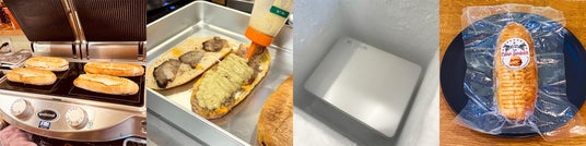 グリラーで焼きたてのサンドに具材やソースかけ、真空パックして急速冷凍しています。