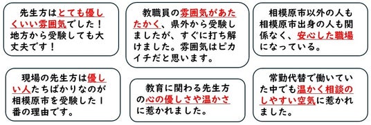 今後採用試験を受験する方に対して、1年先輩の皆さんから相模原市の先生の温かさを感じるメッセージを数多くいただきました。(以下抜粋)